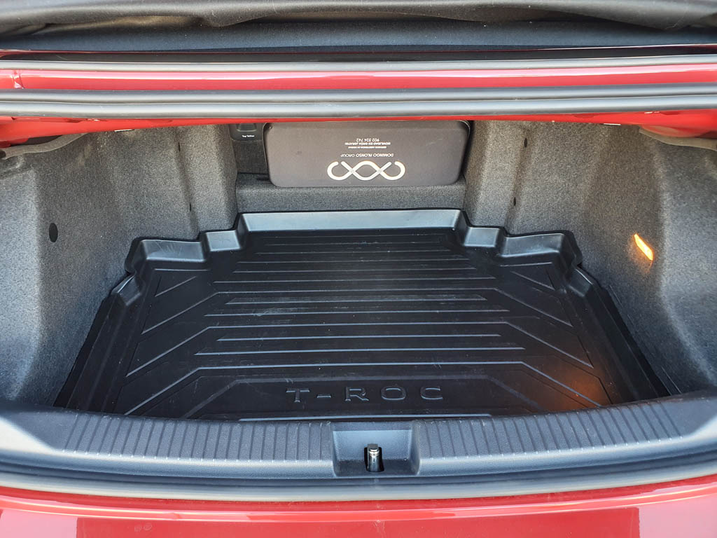 Proporciones dinámicas. El T-Roc Cabrio mide 4.268 mm de largo y tiene una distancia entre ejes de 2.630 mm. La anchura sin retrovisores es de 1.811 mm y la altura, de 1.522 mm. La relación de anchura y altura subraya la dinámica. El centro de gravedad de la carrocería, bajo para lo que es habitual en un SUV, aumenta el placer de conducir. El conductor y el acompañante están sentados a 599 mm sobre el asfalto en relación con la altura de la cadera; y los pasajeros traseros, incluso a 616 m. La capacidad del maletero es de 280 litros, independientemente de si la capota está abierta o cerrada.