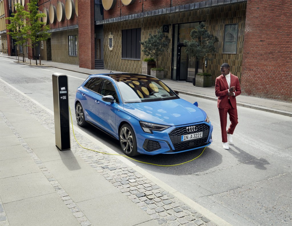 Audi entrega de serie un cable de carga de 230 voltios para utilización en el domicilio. El compacto híbrido enchufable se carga con una potencia máxima de 2,9 kW, lo que permite recargar una batería desde cero hasta el 100% en algo más de cuatro horas. Con la aplicación gratuita myAudi los clientes pueden controlar de forma remota el proceso de carga y la pre-climatización del habitáculo. En función de si la temperatura exterior es baja o alta, se encargan de ello unos calentadores eléctricos o el aire acondicionado eléctrico, respectivamente. En las estaciones de carga públicas el coche se recarga utilizando un cable Modo 3.