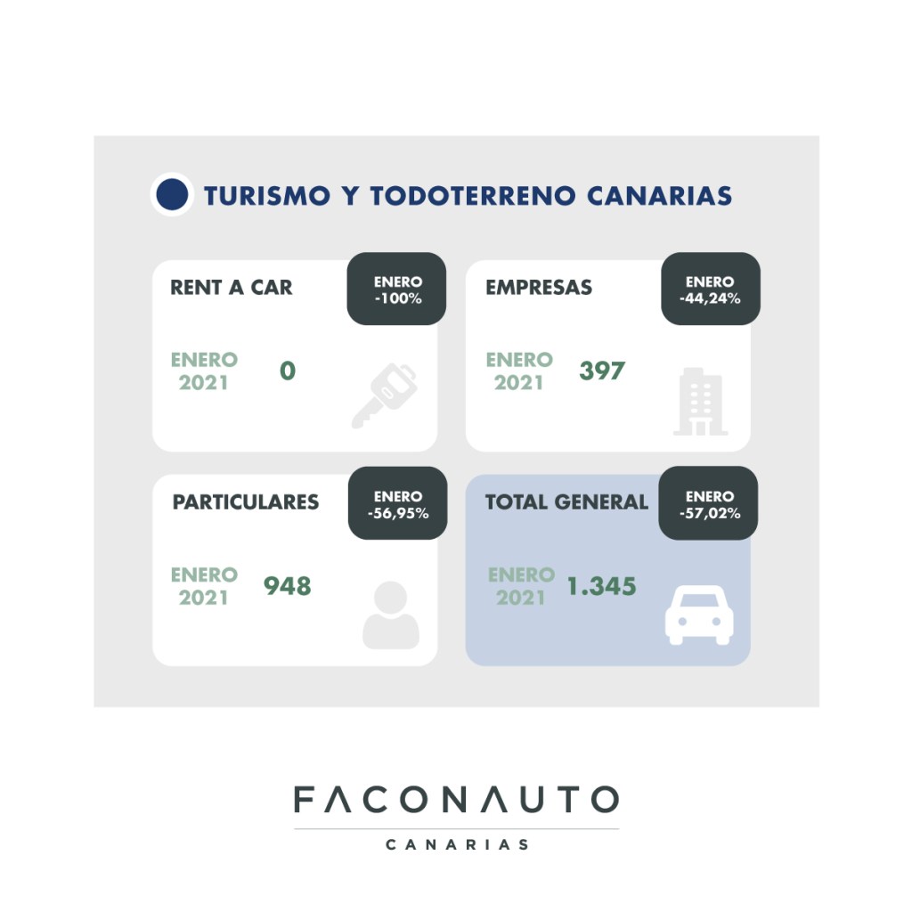 Las ventas de turismos y todoterrenos caen un 57%, con 1345 matriculaciones. El año pasado durante el mes de enero se matricularon 3.129 vehículos. El canal más castigado es el de las alquiladoras, que registra un descenso del 100%. Durante el mes de enero no ha habido una sola matriculación por parte de las empresas de Rent a car. En el canal de particulares, la caída en el mes de enero ha sido del 56,95% con 948 matriculaciones, y en el canal de empresas, la caída ha sido del 44, 24% con 397 matriculaciones en este primer mes de 2021