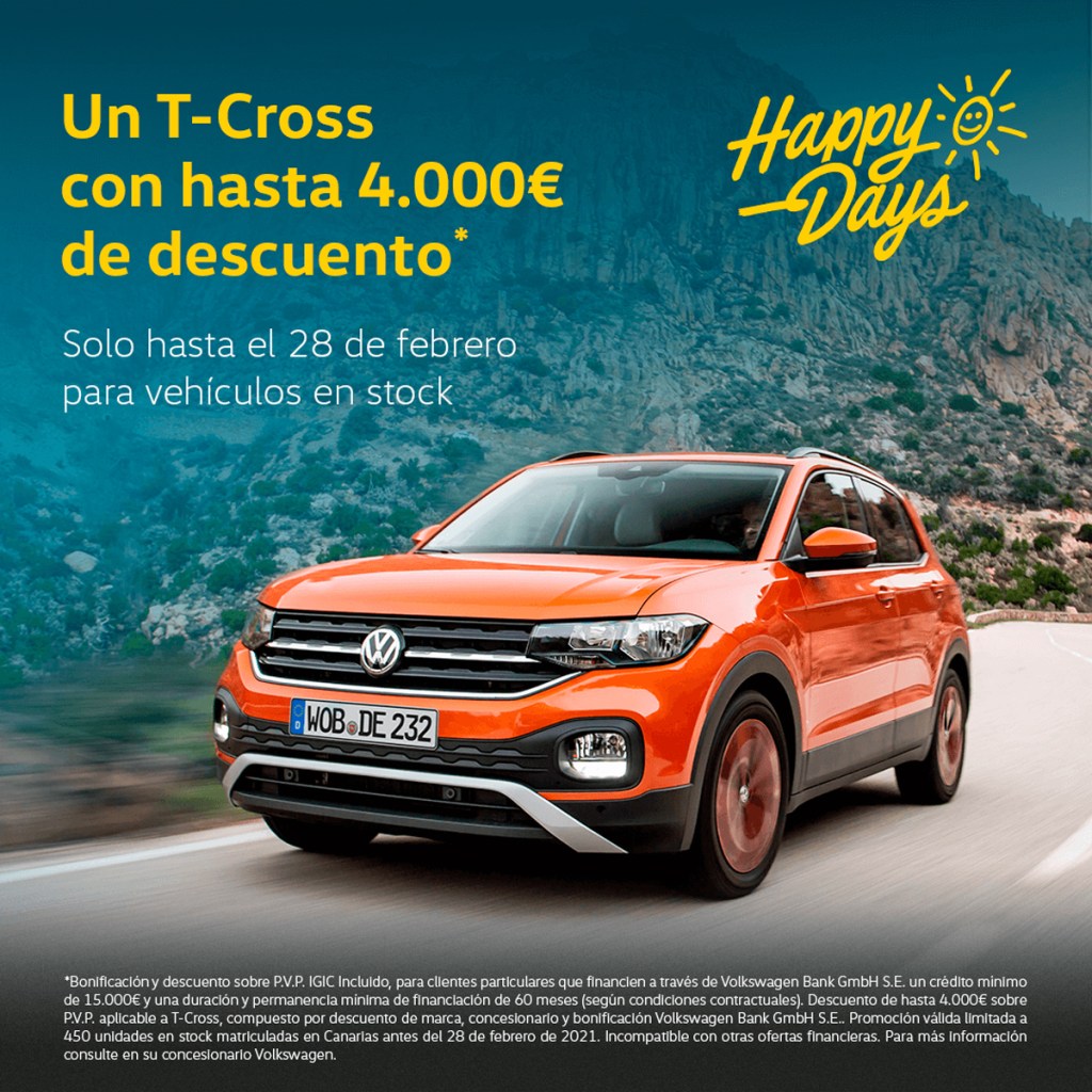 Un descuento de hasta 8.000 € en un Volkswagen ayuda, y mucho, a conseguir la felicidad. Por eso, Volkswagen Canarias vuelve con sus Happy Days hasta el 28 de febrero, con increíbles descuentos en toda su gama.
