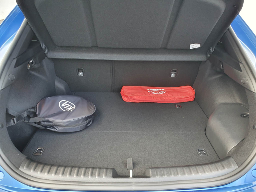 La batería de 8,9 kWh está situada debajo del asiento trasero, junto al depósito de combustible de 37 l. Eso lo diferencia de muchos otros vehículos híbridos enchufables en los la batería ocupa un valioso espacio de carga. El volumen de maletero del Kia XCeed Híbrido Enchufable es 291 litros y aumenta hasta 1.243 l con el asiento trasero abatido. Hay un espacio debajo del piso del maletero de cada coche específico para guardar el cable de carga cuando no se usa.