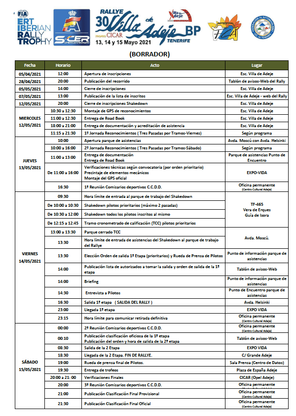 Las inscripciones se abren el 4 de abril y se prolongará hasta las 14:00 horas del 5 de mayo. Toda la información estará disponible, convenientemente actualizada según vayan avanzando las fechas y los acontecimientos, en la web de la prueba http://www.rallyevilladeadeje.com