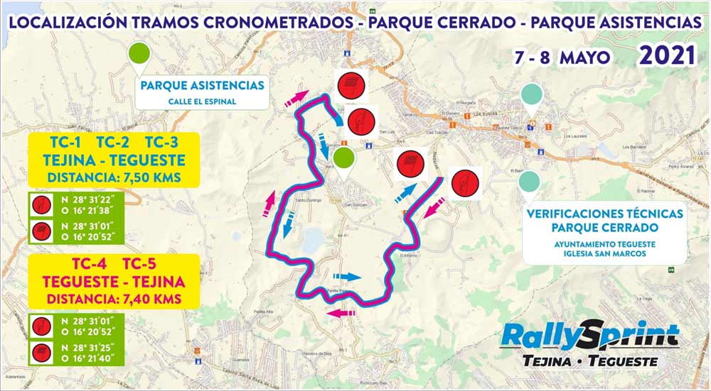 La prueba, a desarrollar el próximo sábado 8 de mayo, se repartirá en 5 tramos cronometrados, los tres primeros en sentido Tejina a Tegueste, y los dos últimos, Tegueste a Tejina. Los mismos arrancarán a las 08.30 horas de la mañana del sábado, si bien, los cierres de carretera están previstos para una hora antes del comienzo de cada especial.