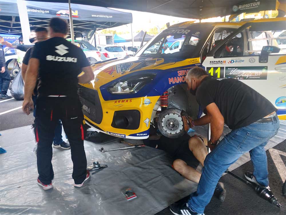 En el parque de asistencias, con todo listo para el cambio de palieres y el montaje de lo necesario para los tramos nocturnos, se trabajo mucho y bien, de tal manera que el equipo fue capaz de desmontar y montar el Suzuki y aún así salir en su minuto rumbo al control Stop.