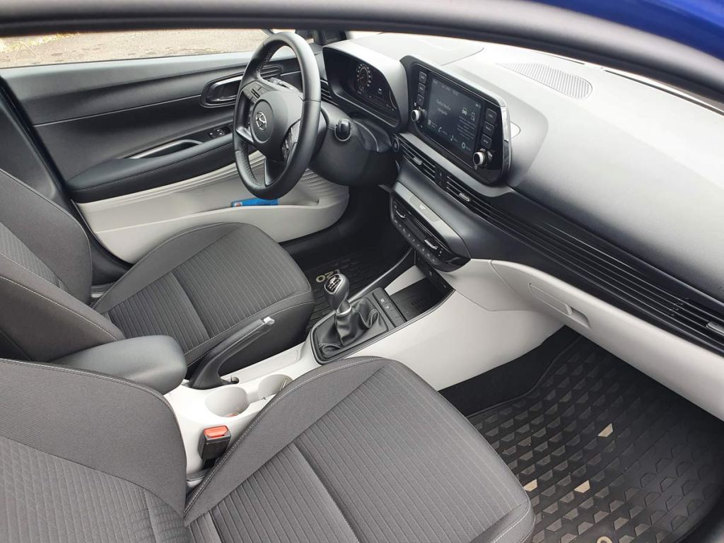 El espacio interior logra una sensación de aireación dentro de la cabina, al tiempo que parece esculpido y atractivo. Un aspecto destacado del diseño son las lamas horizontales que cubren el salpicadero alto y prominente. Esto le da un aspecto muy poco convencional al hacer que el salpicadero delantero se vea liso y ancho.Las puertas del Nuevo i20 abrazan el salpicadero de una manera elegante y sensual, inspirándose en las formas de la naturaleza. La escultura de las puertas encaja perfectamente con la sección del panel de instrumentos. Su refinado volante está equipado con modernos interruptores de palanca, mientras que sus detalles de color también coinciden en todo el interior. Los ocupantes del Nuevo i20 también pueden disfrutar de una agradable iluminación interior por la noche gracias a la nueva tecnología de luz ambiental LED azul. Los clientes pueden elegir entre tres acabados de color interior: negro y negro con inserciones en gris o en verde.
