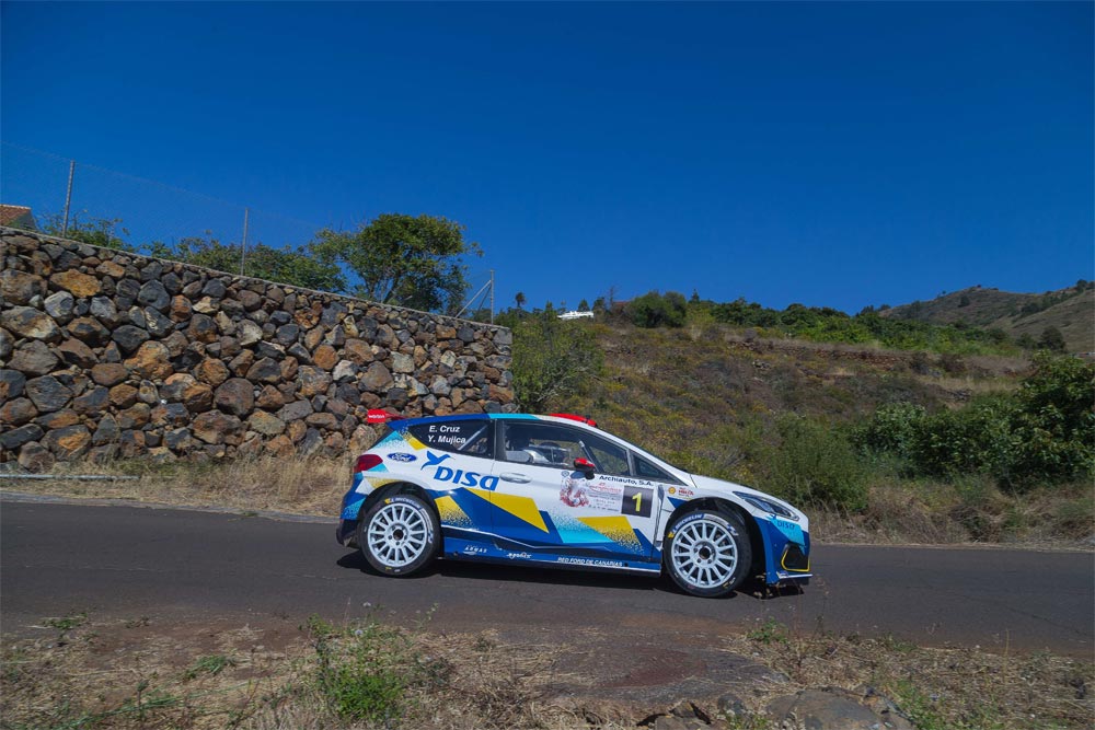 Enrique Cruz-Yeray Mujica lideran la clasificación provisional con su Ford Fiesta R5 MKII. Acumulan un tiempo de 16:44.8 después de marcar dos segundas posiciones y un mejor tiempo en la especial más larga del día, ‘Briesta – Llano Negro’.