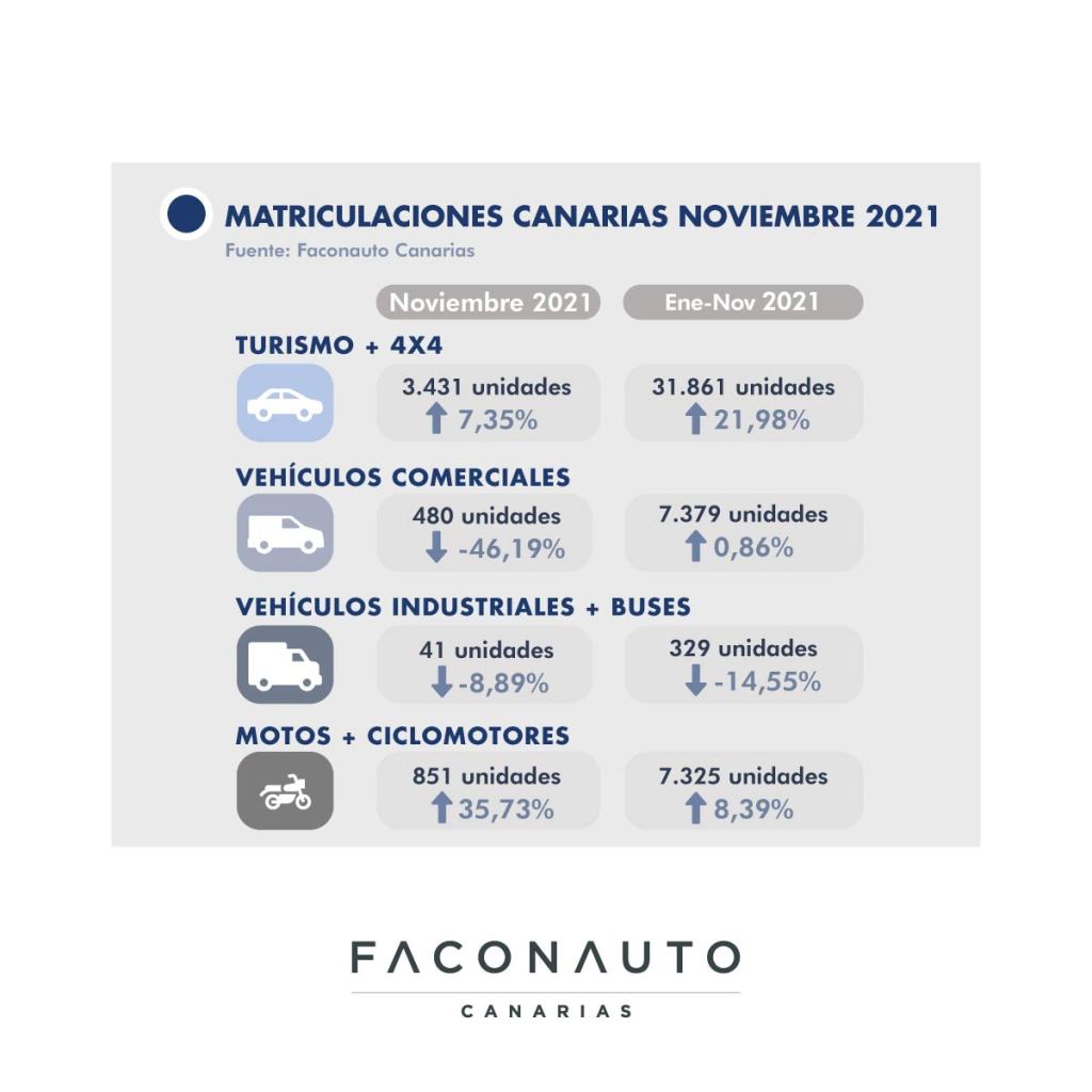 Los datos del pasado mes de noviembre confirman las previsiones que Faconauto Canarias ha ido adelantando en los últimos meses. La crisis de los semiconductores pasa factura al mercado de automóviles y continúa muy lejos de las cifras de ventas anteriores a la pandemia. En el cómputo global, las ventas aumentan ligeramente respecto a 2020 un 7,35% con 3.431 turismos y 4×4 matriculados el pasado mes de noviembre. En el acumulado del año, el sector supera en un 20% las matriculaciones del año pasado. Un mes más, son las matriculaciones por parte de las empresas de Rent a Car las que continúan “tirando” del sector. Durante el mes pasado, en este canal se matriculó un 255,20% más de vehículos que en 2020, pero la patronal alerta del retraso en la entrega de grandes flotas para las empresas de alquiler de vehículos. Se trata de operaciones que no terminan de materializarse porque los vehículos no llegan.