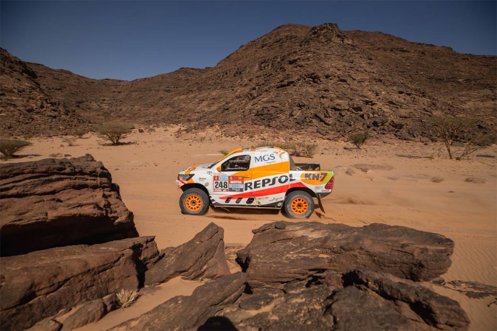 “Hoy no ha sido de las etapas más difíciles del Dakar en cuanto a complejidad y navegación, pero sí era muy bonita. Aun así, ha habido varios puntos donde había cambios de cañones y hemos tenido que estar muy atentos. Ha sido una jornada muy rápida en general y de apenas 300 km. Lo positivo es que no hemos sufrido ningún problema, salvo que al principio hemos tenido que pasar a tres SSV y luego hemos debido parar un momento por el polvo de Dennis Krotov, que se ha incorporado a la pista justo delante de nosotros”, asegura el piloto español.