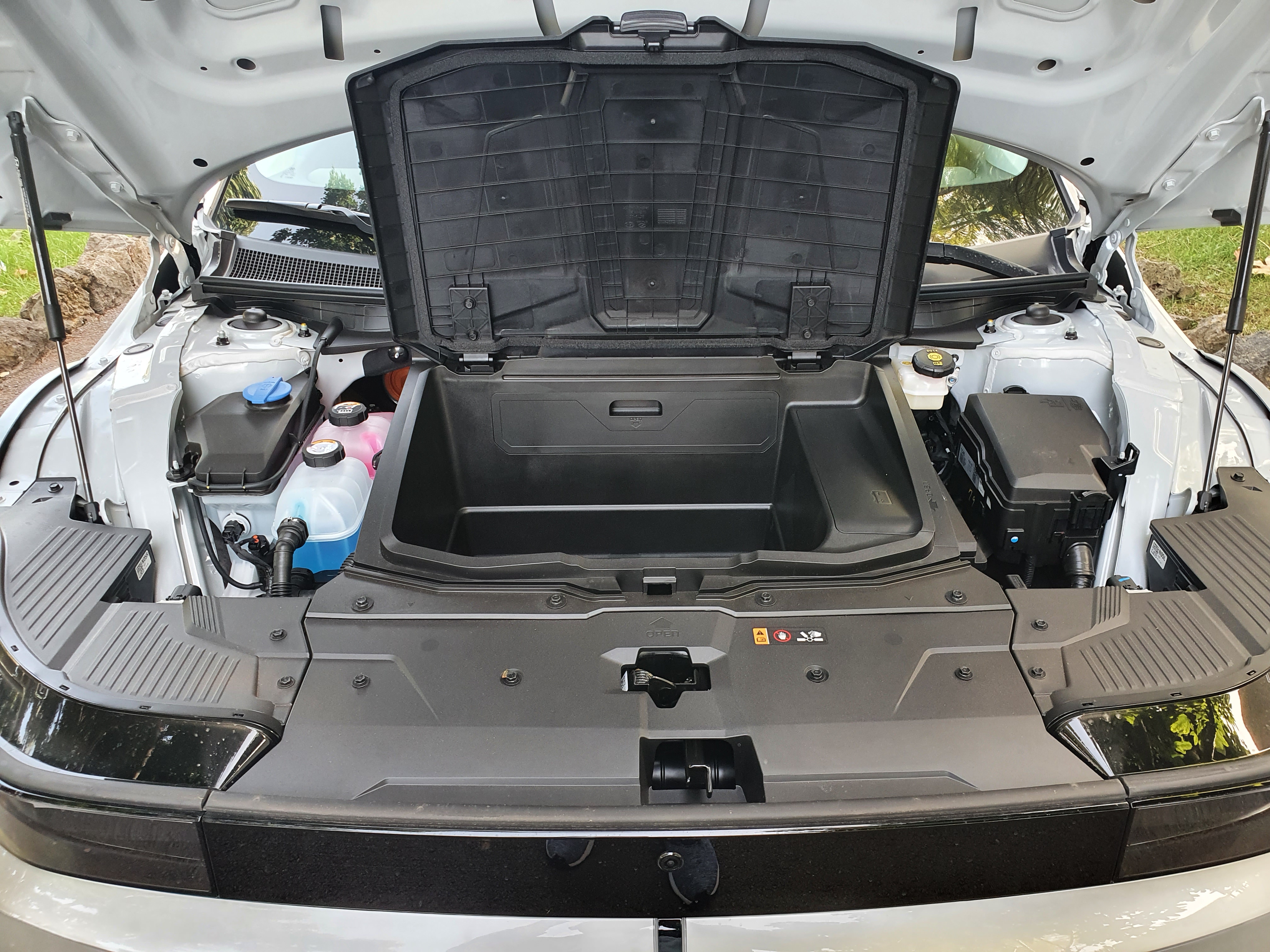 El frontal está equipado con el primer capó clamshell (tipo concha) de Hyundai, que minimiza los huecos entre los paneles para conseguir la mejor aerodinámica. El paragolpes delantero está definido por una llamativa forma de V que incorpora unas distintivas luces de circulación diurna (DRL) que proporcionan una inconfundible firma lumínica al IONIQ 5. Estos pequeños clusters en forma de píxel también están presentes en la parte trasera del vehículo.