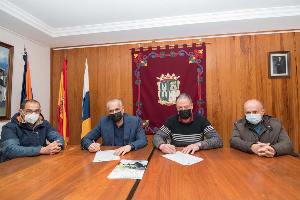 En el Ayuntamiento de San Mateo, Antonio Ortega y Germán Morales estamparon sus respectivas firmas en el convenio de colaboración, acompañados por Miguel Reyes, concejal de Deportes del municipio grancanario, y Miguel Espino, coordinador de Seguridad de esta prueba del FIA European Rally Championship.