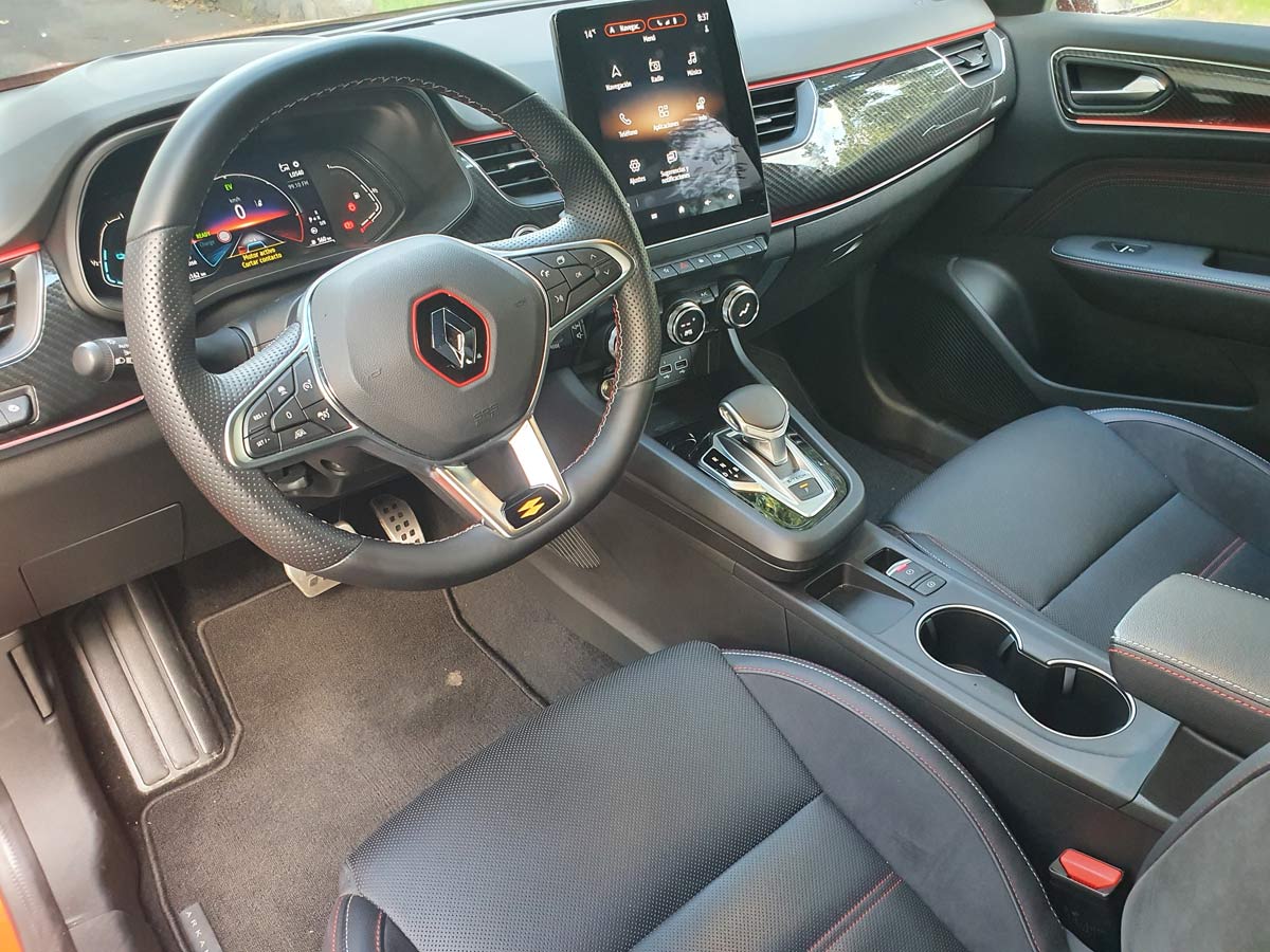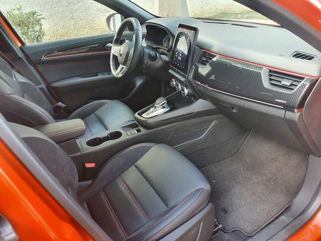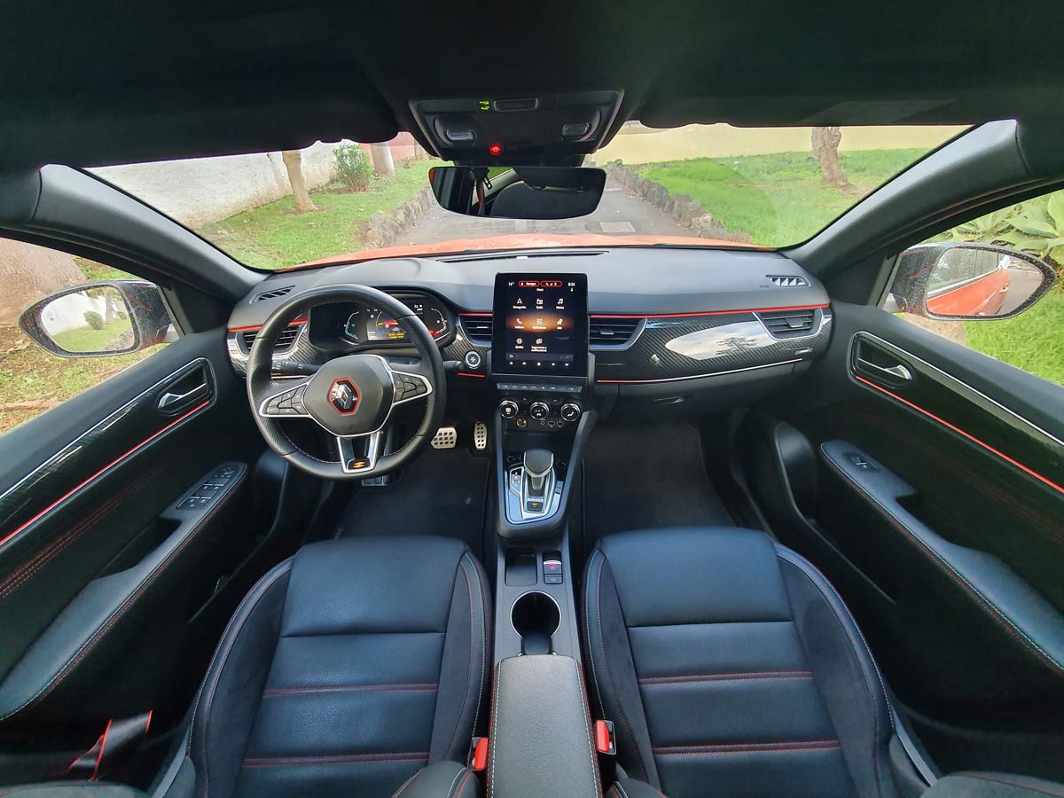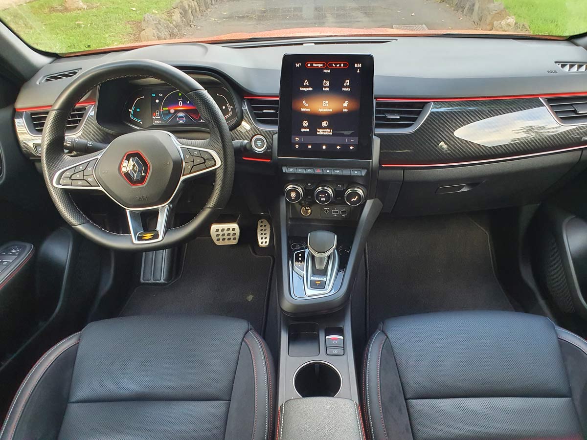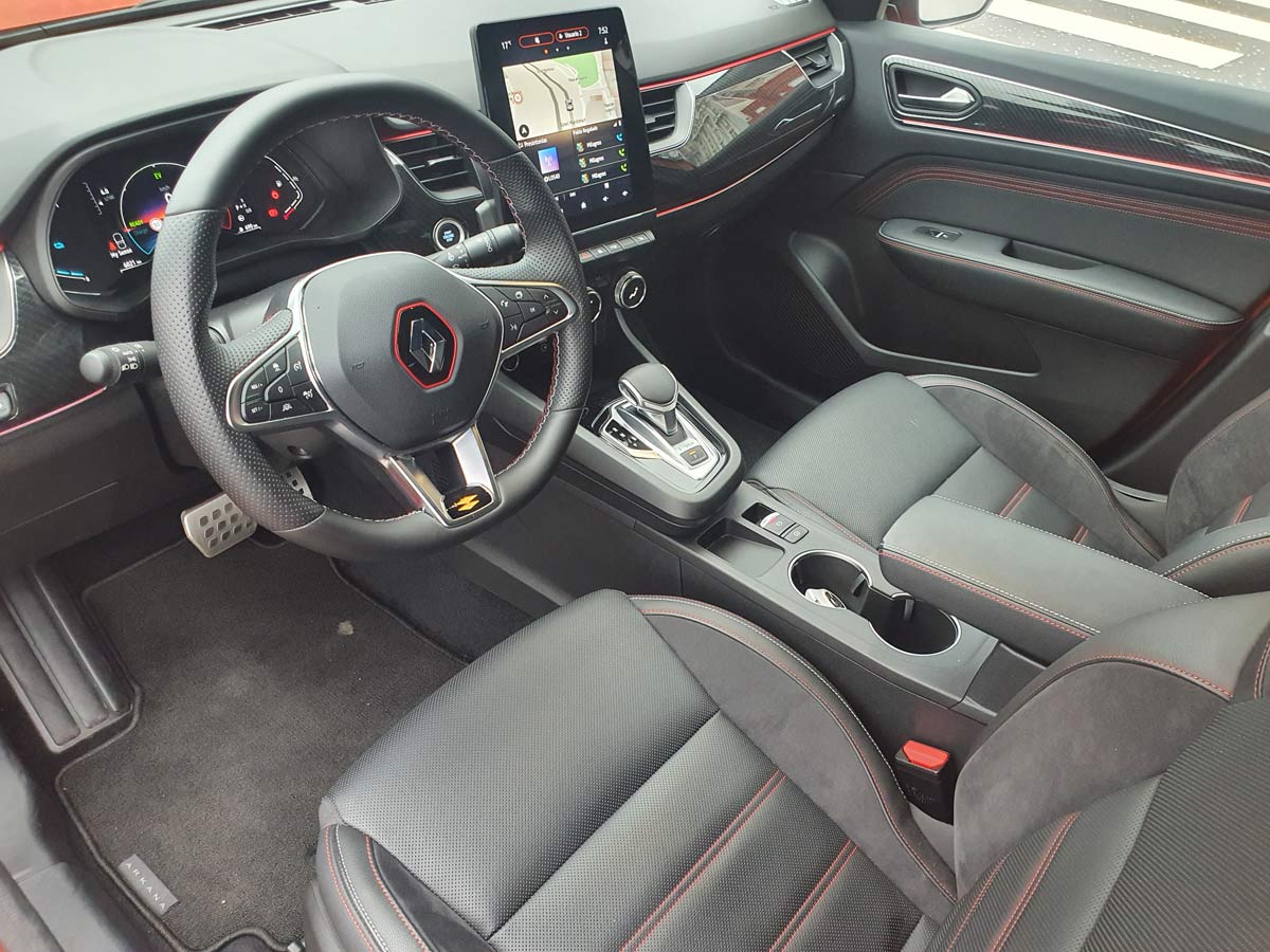 El habitáculo de la versión R.S. Line cuenta con un interior especial, con un revestimiento de puertas y salpicadero acabado en carbono, un embellecedor rojo a lo largo del salpicadero y un techo negro. El volante en cuero y la tapicería mixta cuero / ante están adornados con elegantes y deportivos pespuntes en rojo, ubicados también en los paneles de puerta. Una franja roja resalta los cinturones de seguridad. Los pedales de aluminio, la palanca de velocidades de tipo e-shifter (con el motor E-TECH Híbrido) y las placas R.S. Line completan el conjunto.