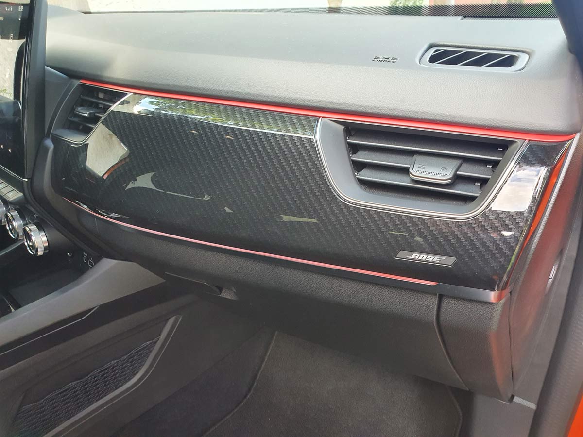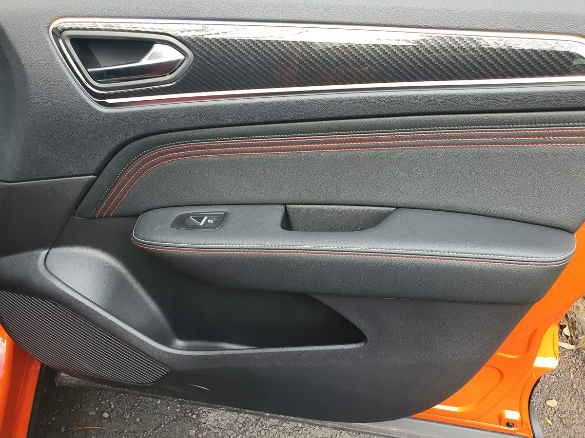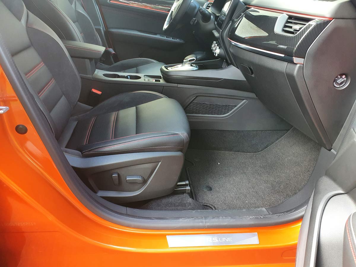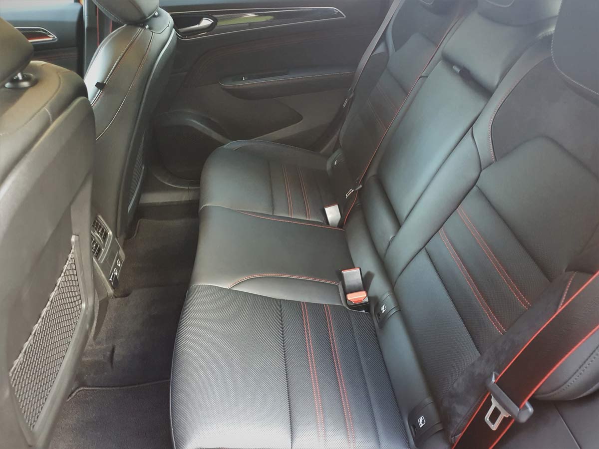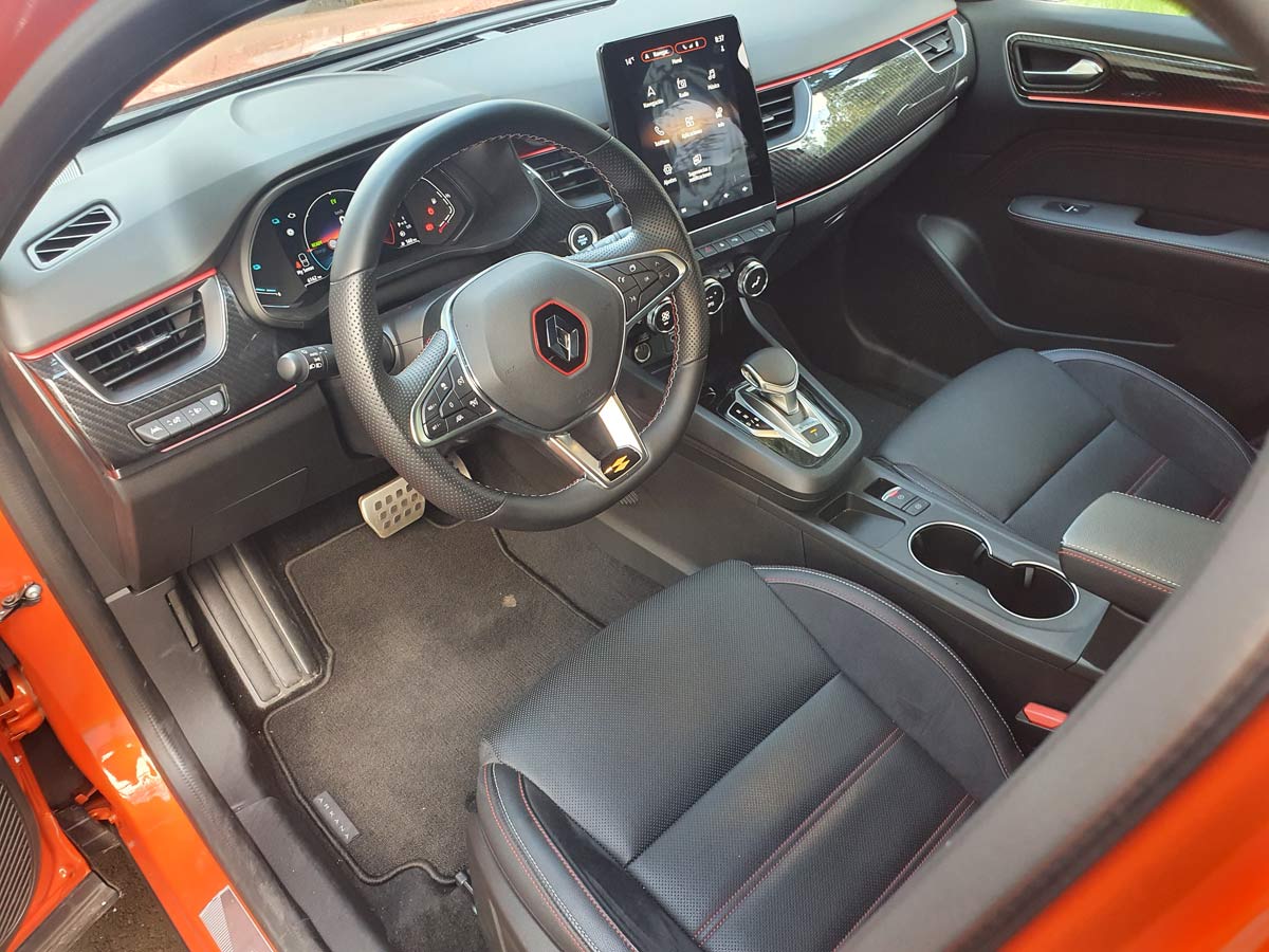 El habitáculo de la versión R.S. Line cuenta con un interior especial, con un revestimiento de puertas y salpicadero acabado en carbono, un embellecedor rojo a lo largo del salpicadero y un techo negro. El volante en cuero y la tapicería mixta cuero / ante están adornados con elegantes y deportivos pespuntes en rojo, ubicados también en los paneles de puerta. Una franja roja resalta los cinturones de seguridad. Los pedales de aluminio, la palanca de velocidades de tipo e-shifter (con el motor E-TECH Híbrido) y las placas R.S. Line completan el conjunto.