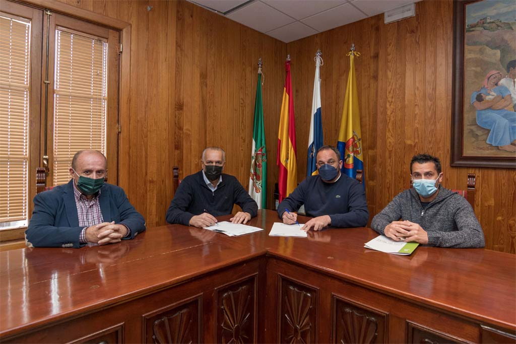 Arropando a Raúl Afonso y a Germán Morales en la firma de este convenio, también estaban presentes Gilberto Sosa, concejal de Deportes del Ayuntamiento de la Villa de Moya, y Miguel Espino, coordinador de Seguridad del 46 Rally Islas Canarias.