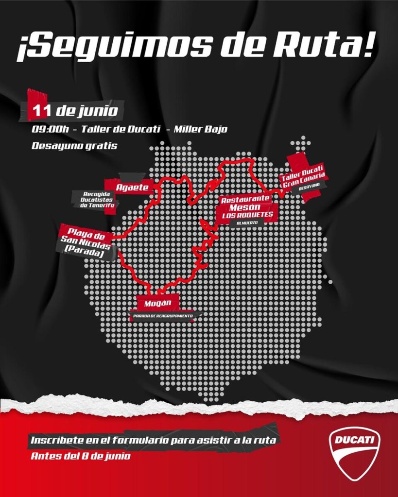 La jornada partirá desde el Taller de Ducati Gran Canaria, en Miller Bajo, a las 9:00 con un desayuno de cortesía ofrecido por la organización. Una vez listos, la ruta comenzará a las 9:30 bordeando la costa norte, continuará por la Playa de San Nicolás, La Aldea, en la que se hará una parada para estirar las piernas y beber algo. Seguirá con la subida a las presas desde Mogán, lugar en el que se hará una parada de reagrupamiento en caso de ser necesario y luego concluirá en Valleseco, donde está previsto que los participantes que lo deseen disfruten juntos de una comida. Con este evento, Ducati Canarias espera reunir de nuevo a toda la familia Ducatista y pasar un día brutal con mucho gas.