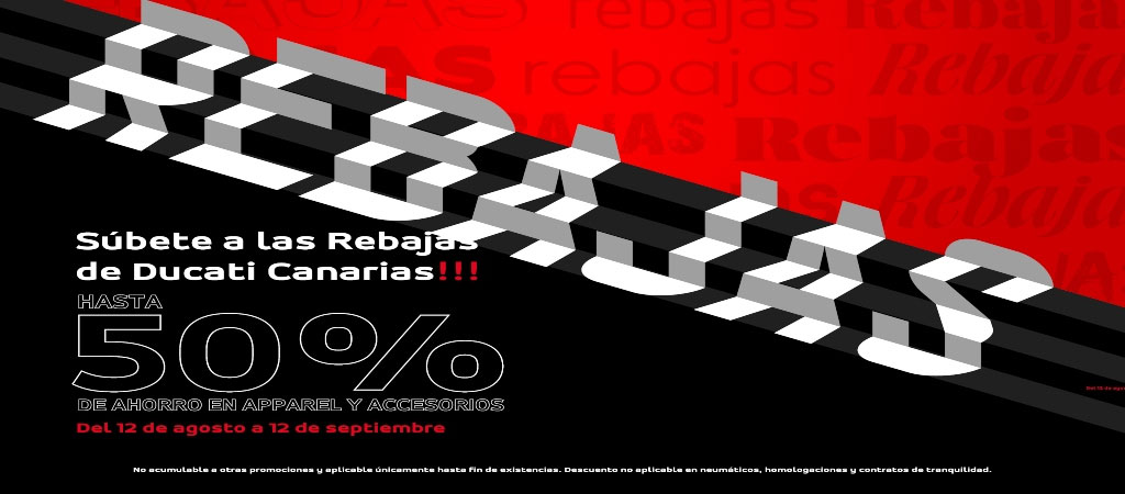 Ducati Canarias ofrece hasta un 50% de descuento en apparel y accesorios de productos en stock.