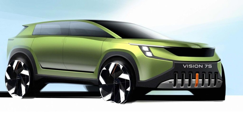 Los bocetos del nuevo concepto del ŠKODA VISION 7S, totalmente eléctrico muestran un llamativo diseño en su parte frontal. La parrilla del nuevo ŠKODA más ancha y plana, es oscura y cerrada. Los faros se han recolocado hacía los bordes del vehículo, dispuestos en dos filas y con la franja de luz diurna claramente definida sobre ellos en unas alas pronunciadas para extender el grupo de luces y formar la ‘T’.