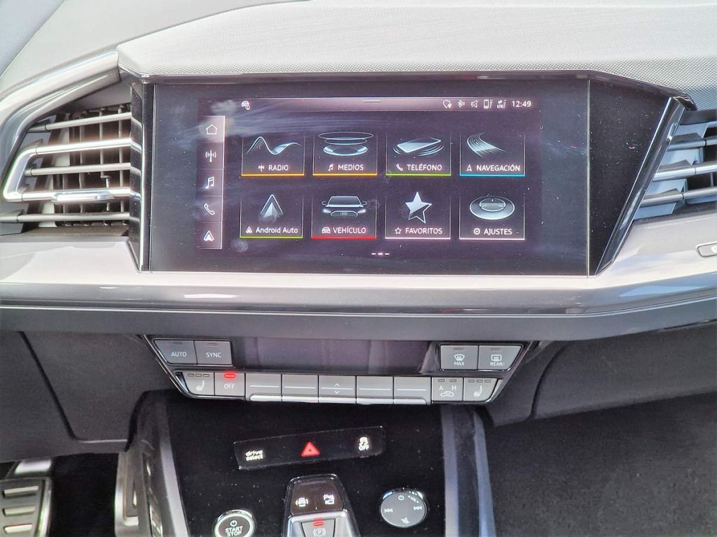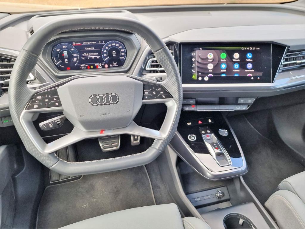 El volante del Q4 Sportback e-tron también muestran cuál es la tendencia de Audi de cara a la movilidad del futuro. Con su diseño de doble brazo, pertenecen a una nueva generación. Los cuatro aros en su parte central muestran un diseño plano y con la línea interior S line cuentan con un emblema S. La parte superior de los brazos incorpora superficies táctiles con acabado black panel, cuyas zonas funcionales también tienen retroiluminación para indicar los respectivos mandos activos.
