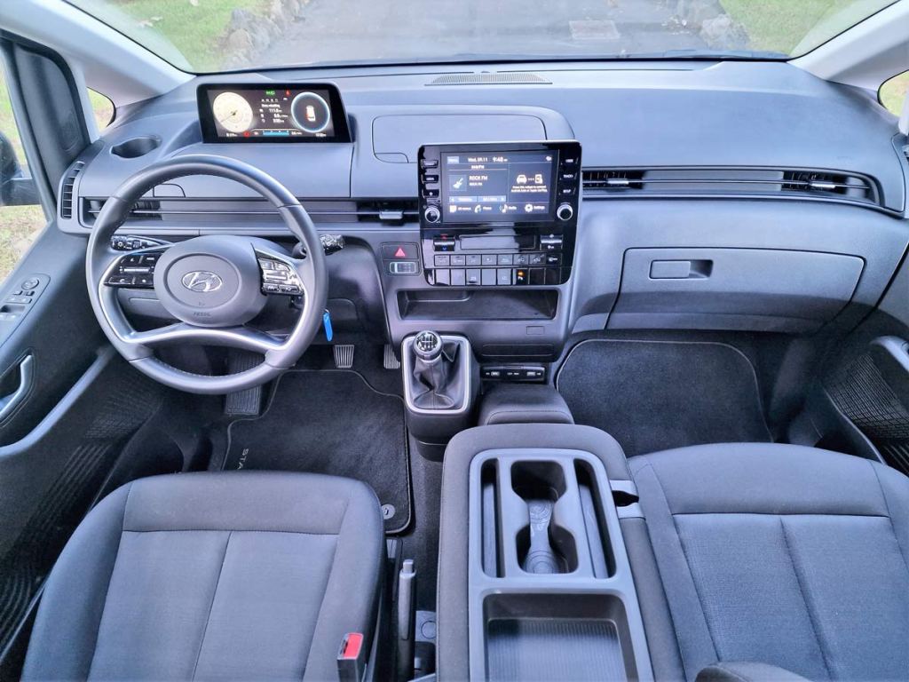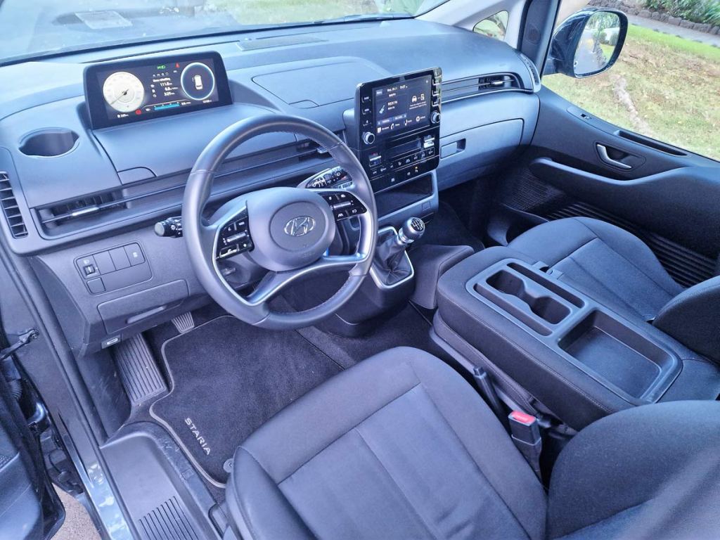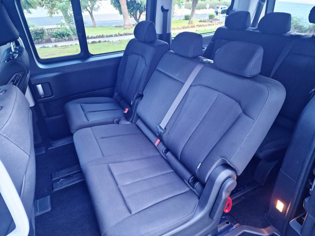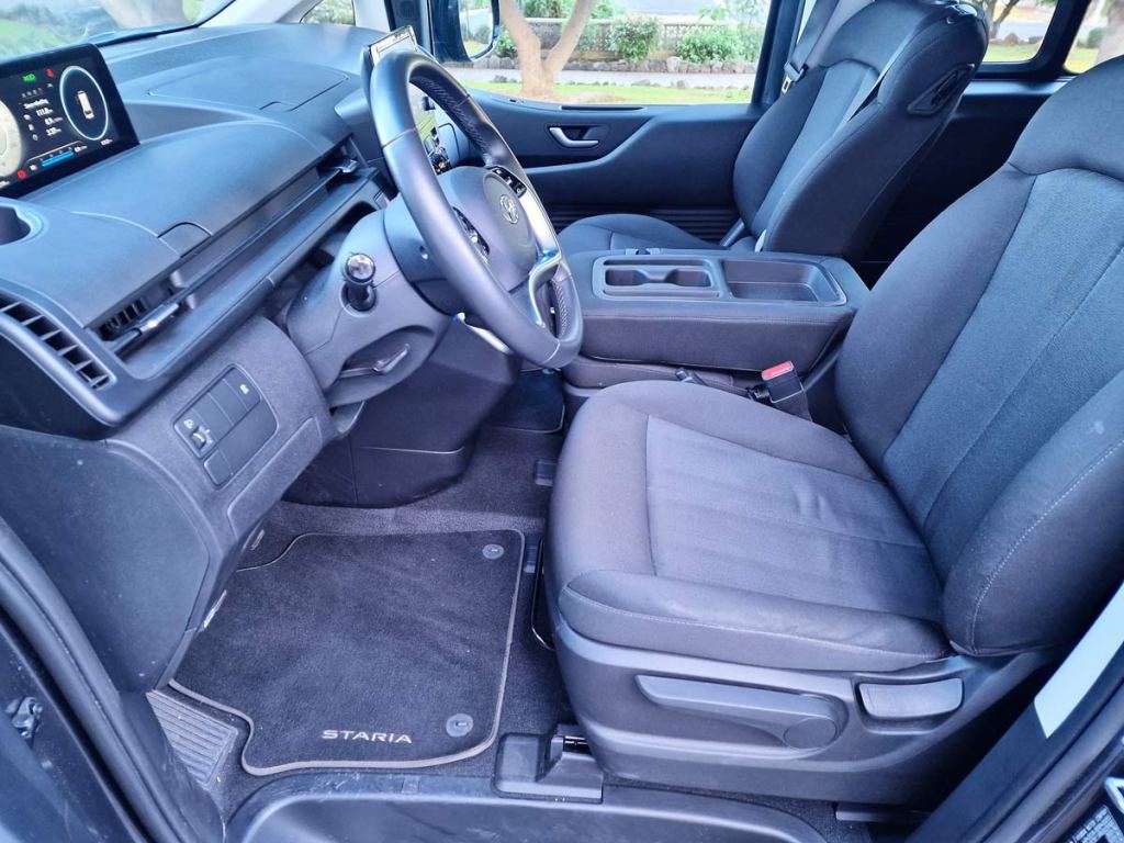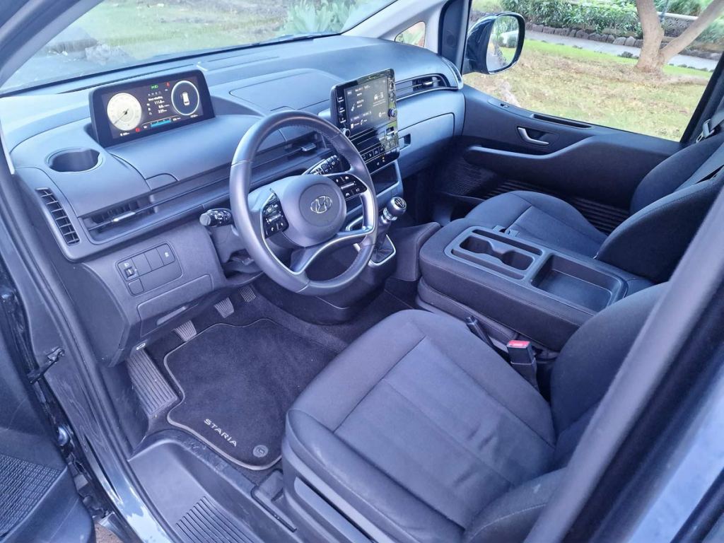 La nueva STARIA está disponible en Canarias para el transporte de hasta 9 personas en tres filas de asientos. Los asientos del conductor y de los pasajeros de la primera fila están diseñados para ofrecer una sensación de espacio y confort. La sencilla distribución interior de la STARIA se centra sólo en lo esencial para ofrecer más espacio y flexibilidad a los pasajeros. La guantera del asiento del pasajero de la primera fila se ha desplazado hacia delante para ofrecer más espacio para las piernas.