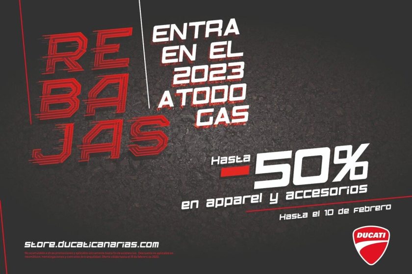 Hoy de enero arrancan las rebajas Ducati Canarias, y hasta el 10 de febrero estarán disponibles ahorros de hasta un 50% en accesorios y apparel