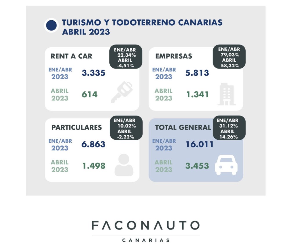 Canarias, 2 mayo de 2023. El crecimiento que hasta ahora venía experimentando el automóvil en Canarias, recordemos que el pasado mes de marzo las matriculaciones de turismos y todoterreno crecían un casi un 50%, parece haberse frenado durante el pasado mes de abril. Las matriculaciones de turismos y 4×4 crecen un 14% el pasado mes, con 3.453 unidades matriculadas.