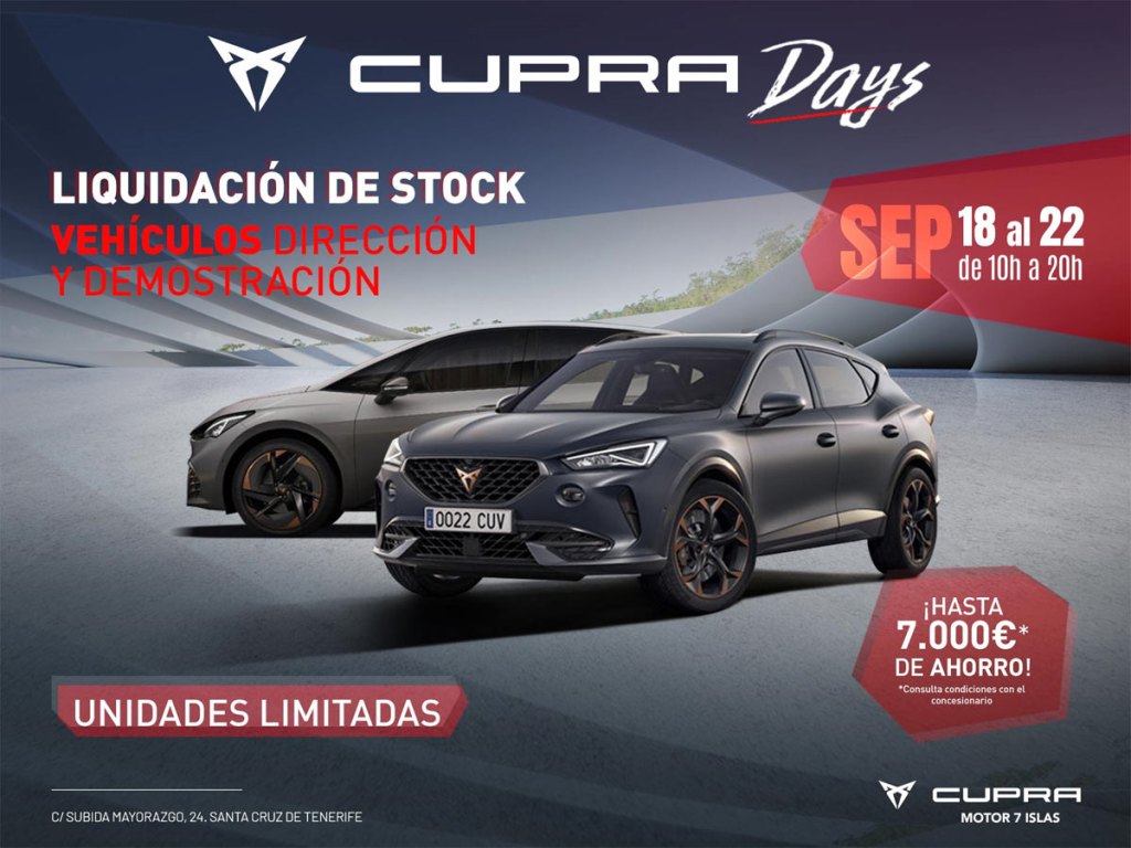 CUPRA Motor 7 Islas dará el pistoletazo de salida a los CUPRA DAYS el día 18 de septiembre, y anima a todos los interesados a acudir al Concesionario oficial CUPRA en el Polígono Mayorazgo nº 24, Santa Cruz de Tenerife para conseguir la mejor oferta.