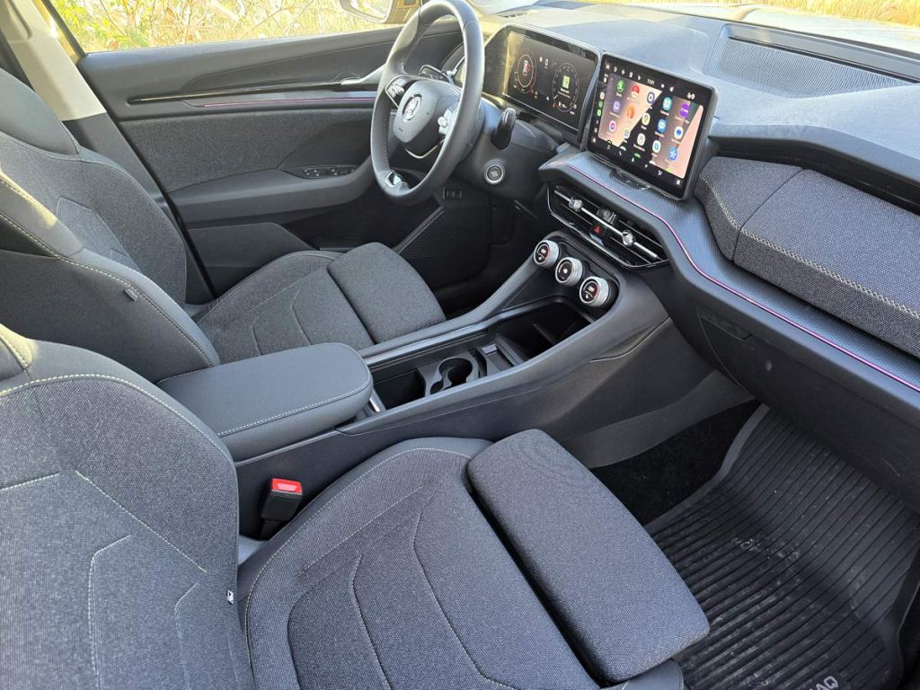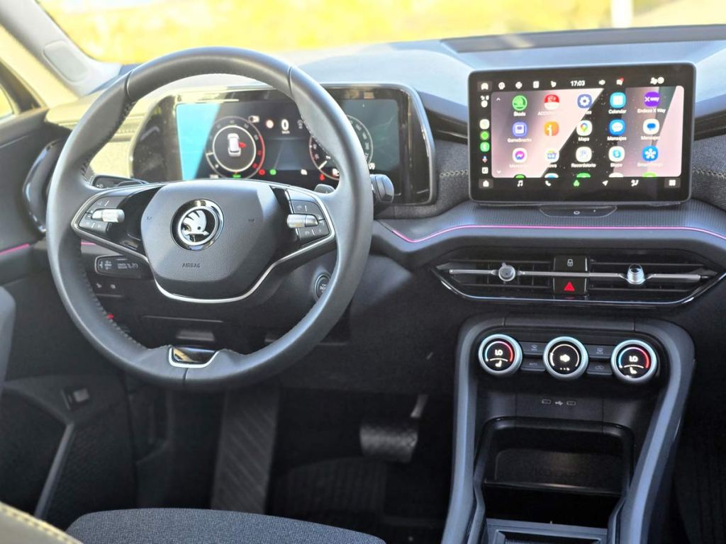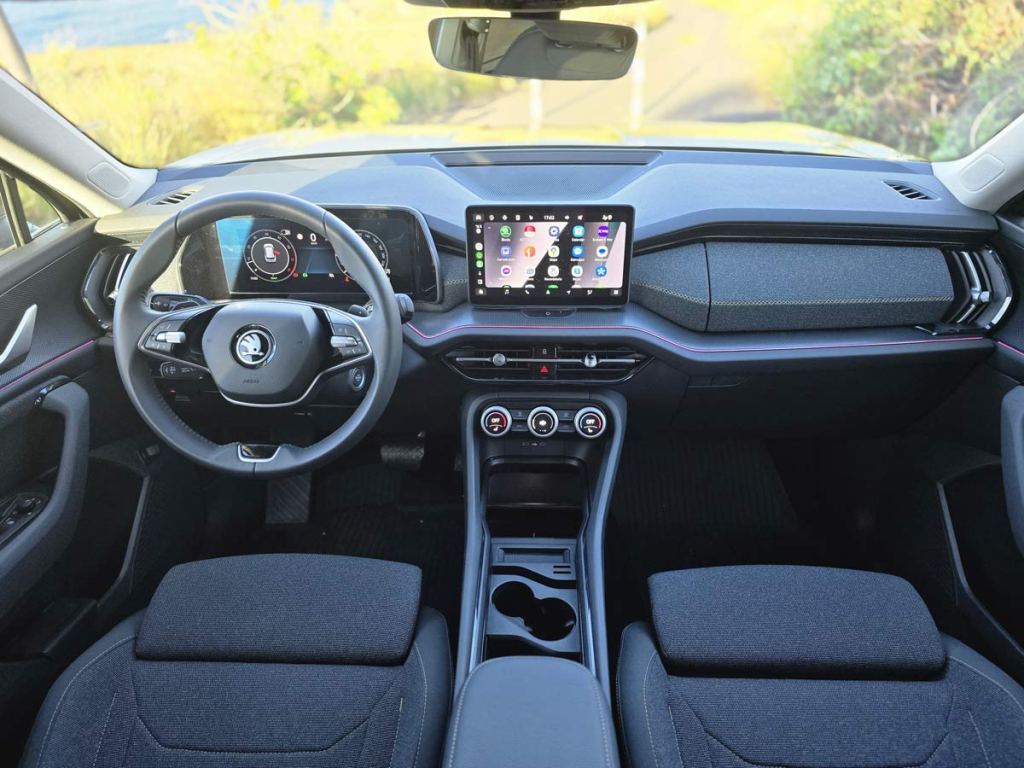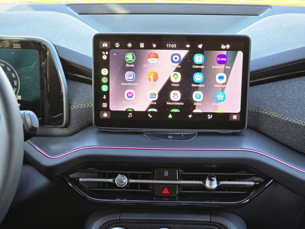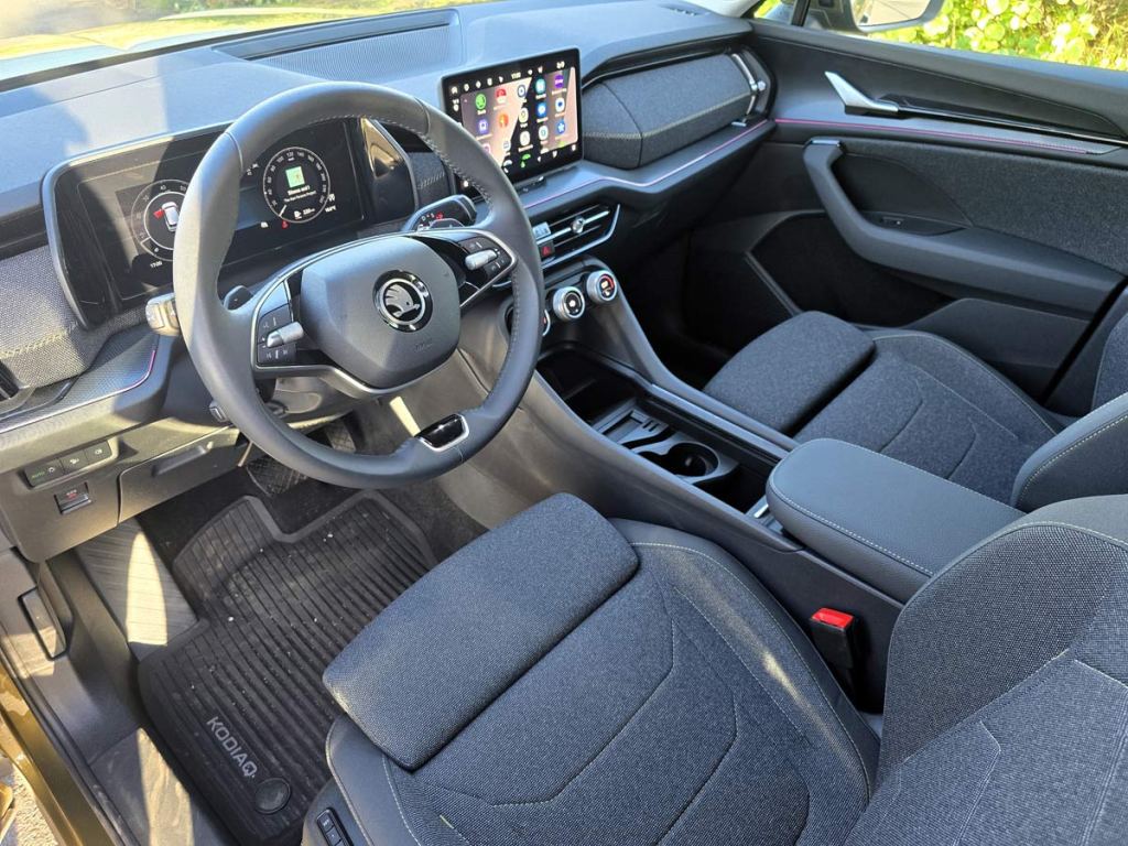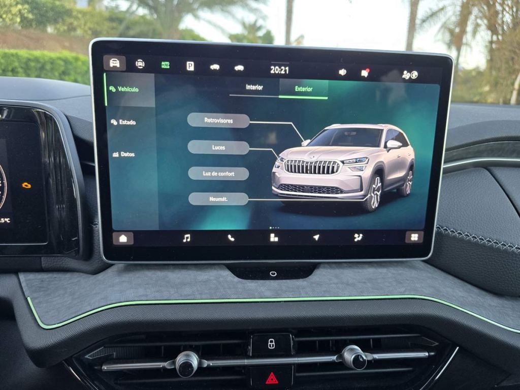 En su interior, el Kodiaq no decepciona. Cuenta con una pantalla táctil central de 12.9 pulgadas que se convierte en el centro de operaciones del vehículo, proporcionando acceso a todas las funcionalidades de forma intuitiva y avanzada. Este sistema de infoentretenimiento es compatible con Apple CarPlay y Android Auto, permitiendo una integración perfecta con los dispositivos móviles de los usuarios. Además, el coche cuenta con un sistema de sonido premium que garantiza una calidad de audio que transformará cada viaje en una experiencia única.
