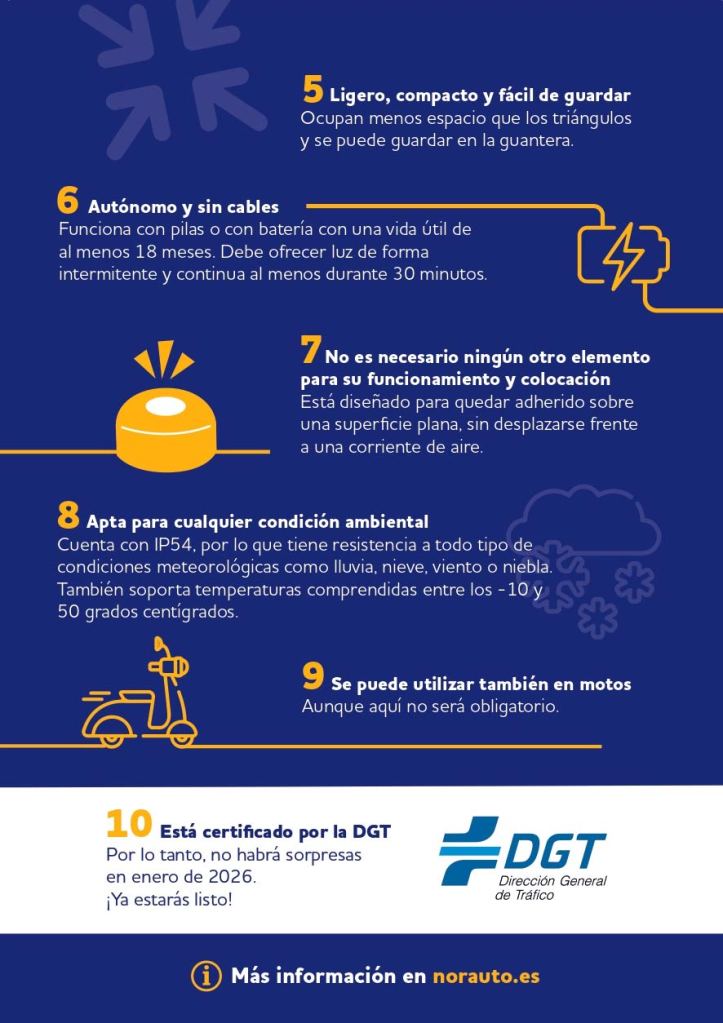 Este dispositivo sustituirá definitivamente a los triángulos de emergencia. A seis meses de su obligatoriedad,Norauto, la cadena de mantenimiento y equipamiento integral del automóvil, destaca que sólo se podrán utilizar aquellos dispositivos que estén homologados y, por lo tanto, que cumplan con las especificaciones técnicas marcadas por Tráfico. La marca enumera qué factores hay que tener en cuenta para reconocer qué dispositivos se pueden utilizar.
