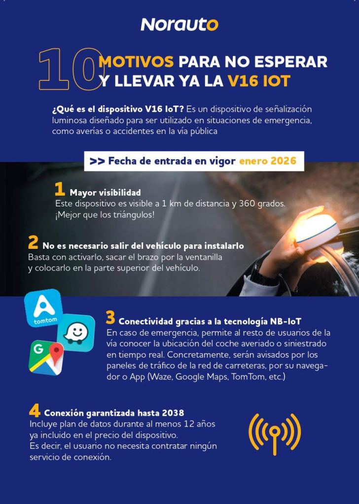 “Se aproxima la fecha en la que el dispositivo V16 conectado y homologado por la DGT será definitivamente obligatorio y pasará a sustituir a los históricos triángulos de emergencia. Actualmente, muchos conductores cuentan con esta baliza luminosa. Sin embargo, muchas no se podrán utilizar a partir de 2026, ya que no cumplen con los requisitos técnicos exigidos. Hay que tener en cuenta que los primeros dispositivos luminosos que salieron al mercado no contaban, por ejemplo, con la conexión que sí deben tener los que se utilizarán a partir de enero del próximo año, recoge Sergio Expósito, responsable de Mercado de Herramientas y Averías en Norauto España.