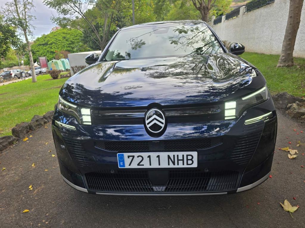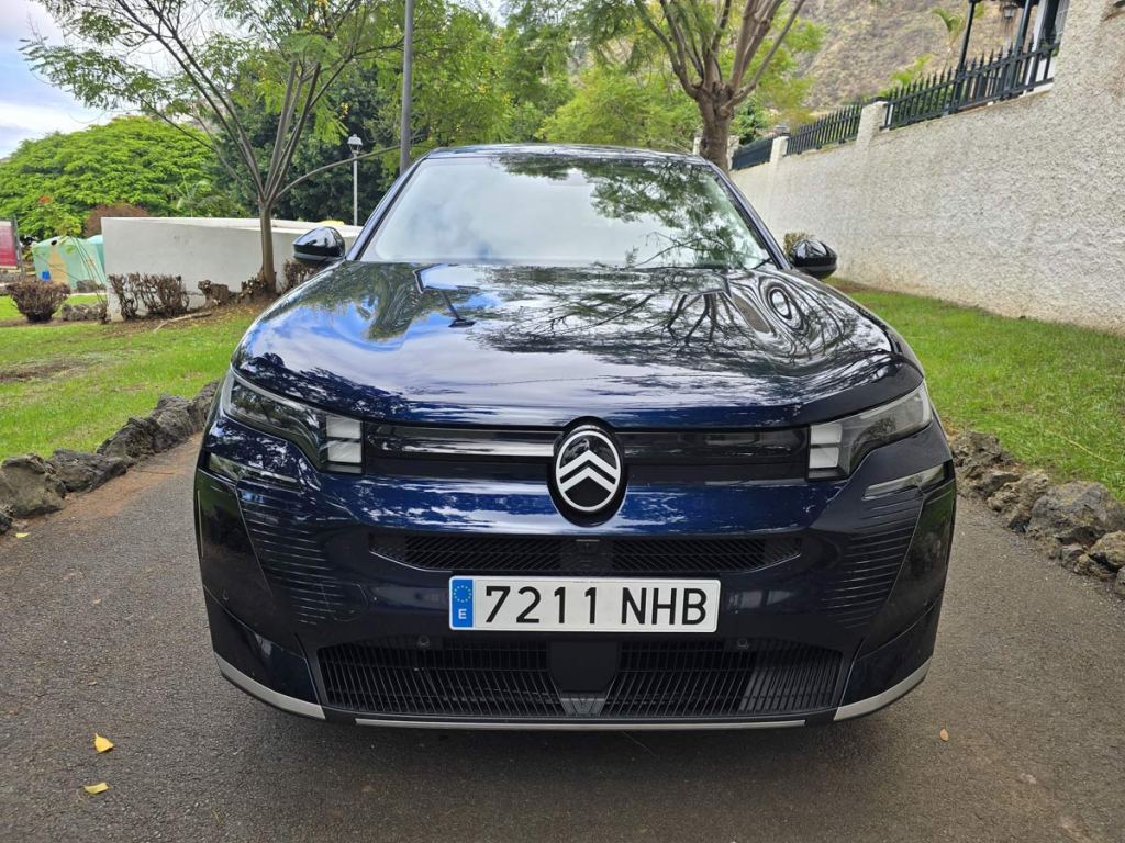 El frontal transmite fuerza y fluidez. En el centro luce con orgullo el nuevo logotipo de Citroën. La firma luminosa de tres puntos se interpreta con segmentos horizontales especialmente finos, que subrayan la elegancia y refuerzan la sensación de anchura. Los faros Matrix LED se unen mediante una franja negra brillante, discreta y sofisticada. Destacan también las ranuras moldeadas que animan la superficie plana y evocan los motivos de la rejilla en forma de chevron. En la versión eléctrica, la parte delantera está completamente cerrada para optimizar la eficiencia aerodinámica.